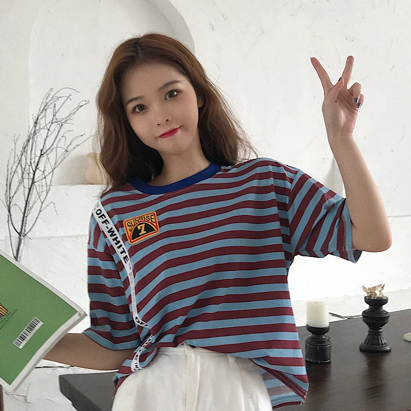 Harajuku Vintage Striped T-Shirt Women Summer 2019 Letter Embroidered Loose O-neck Tops Tee Ulzzang