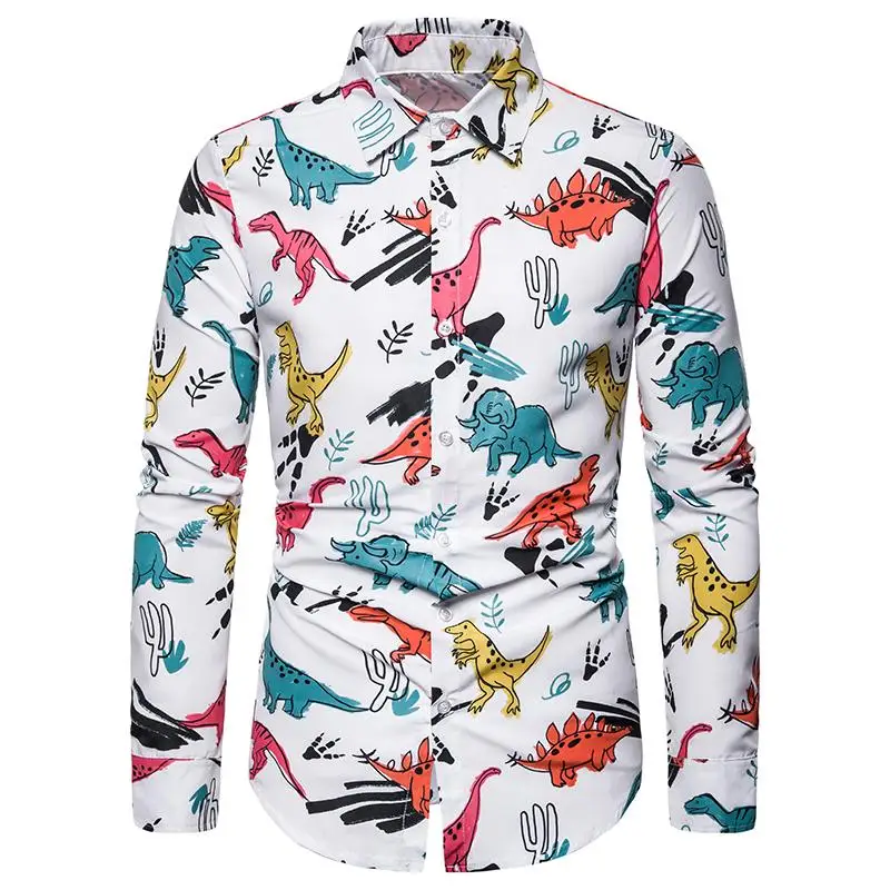 Social Shirt Men's Clothing Fashion Dinosaur print Blouse Men New model Shirts Stay Slim fit Casual